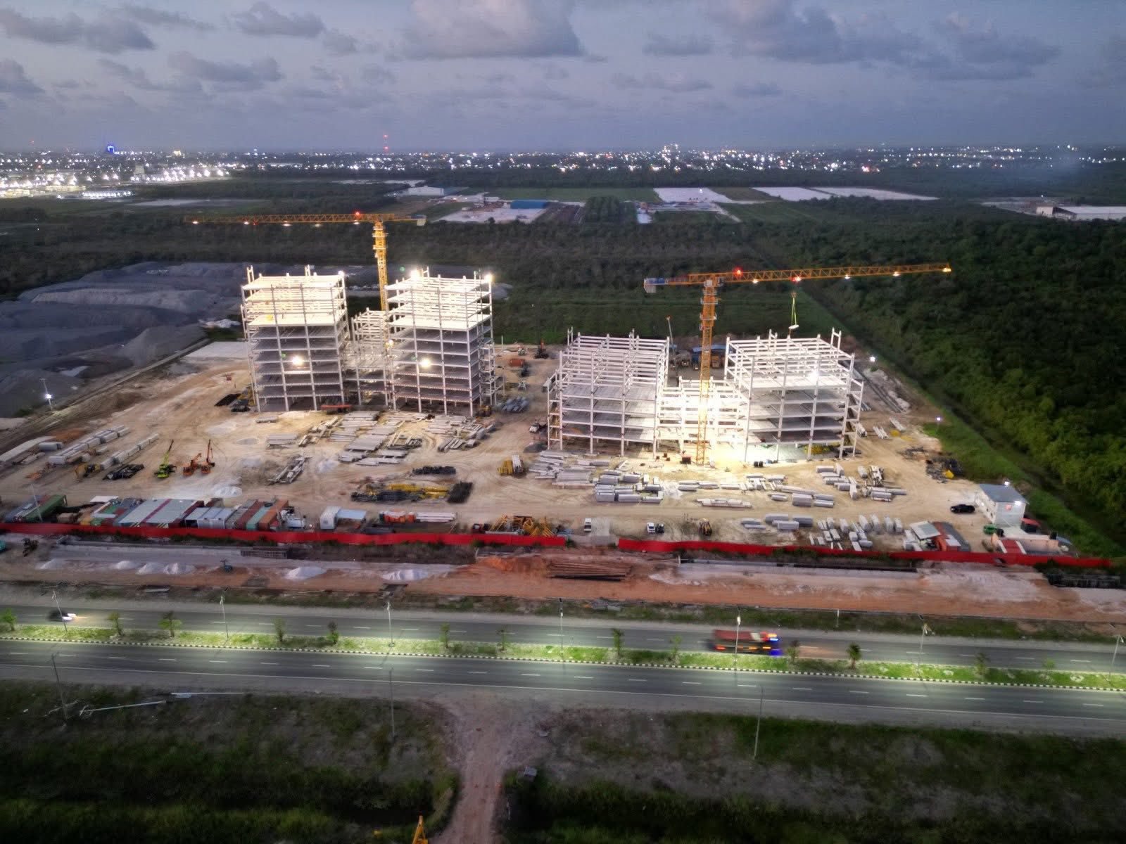 Infrastructure works are progressing, with internal roads forming and the drainage network, including the northern, eastern, and western channels, in progress.