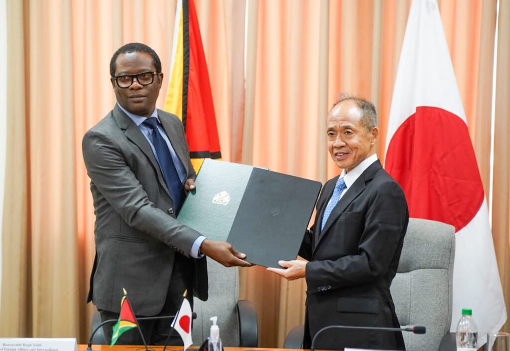 The document was inked by Minister of Foreign Affairs and International Cooperation, Hugh Todd, and Japanese Ambassador to Guyana, His Excellency, Dr Akima Umezawa, during a ceremony at the Ministry of Foreign Affairs and International Cooperation in Georgetown.